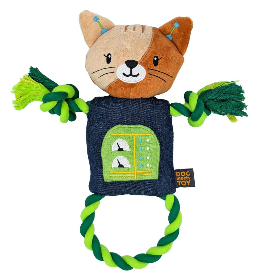 Do you have a pooch who would love to have a droid buddy? Then, a Dog Meets Toy Cat Robot will be the best companion for your canine friend. Each Dog Meets Toy Robot is made of durable plush and denim fabric with strong reinforced seams. Each robot has a sturdy “through the body rope” design for many games of tug-of-war and fetch. This cat contains two squeakers and is lined with strong, crinkly fabric for hours of fun! This great toy even has an embroidered masked face, antennas, and “computer control panel”! Each Dog Meets Toy Cat Toy measures approximately 14” x 10”.