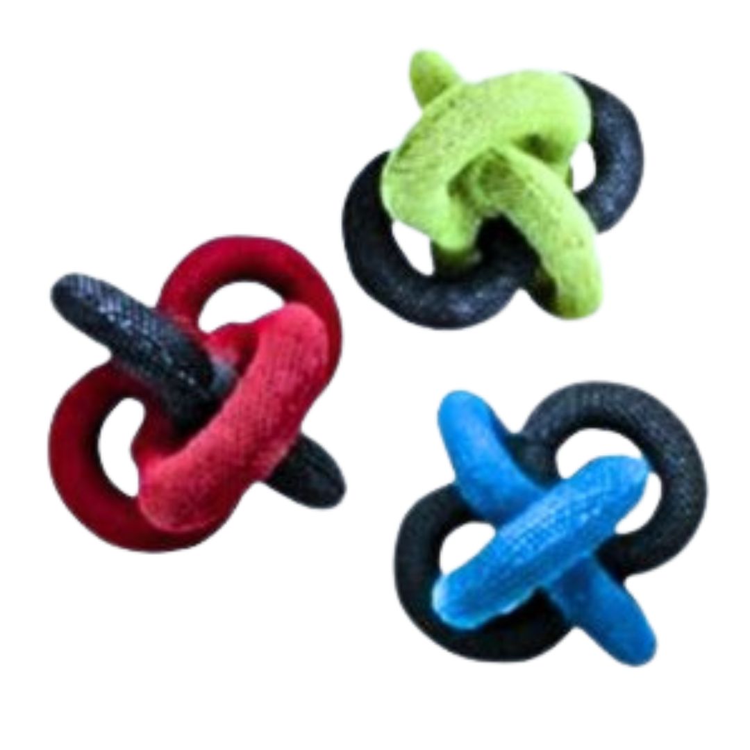 Do you have a best buddy who loves a game of fetch? Then, a Loopies Kickers Ball will be the best new toy for your playful pup. Each kicker is made from a durable double-layered tough mesh fabric that is constructed into an intertwined pretzel shape for hours of tugging, punting, and snatching fun! Kickers also have multiple squeakers for added enjoyment. Each Loopies Kickers Ball Dog Toy measures approximately 8”. Kickers are available in color choices of Blue, Green, or Red.