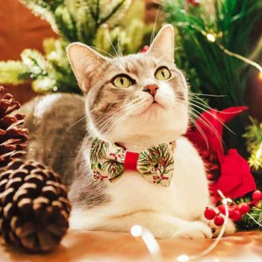 Do you have a kitty that loves to be adorned in fancy apparel? Then a Made by Cleo Pine and Berries Bow Tie Cat Collar is the purrfect solution for your feline friend’s special occasion. Each Cleo Bow Tie Cat Collar is constructed of a durable printed fabric with a matching designer bow. These collars have a breakaway buckle to ensure the safety of your cat. A decorative bell is attached to this collar to alert people and pets of your kitty’s whereabouts. The bow measures approximately 3” x 1.75”. The Made by Cleo Pine and Berries Bow Tie Cat Collar is ½” wide and is adjustable to fit an adult cat from 8” to 13”.