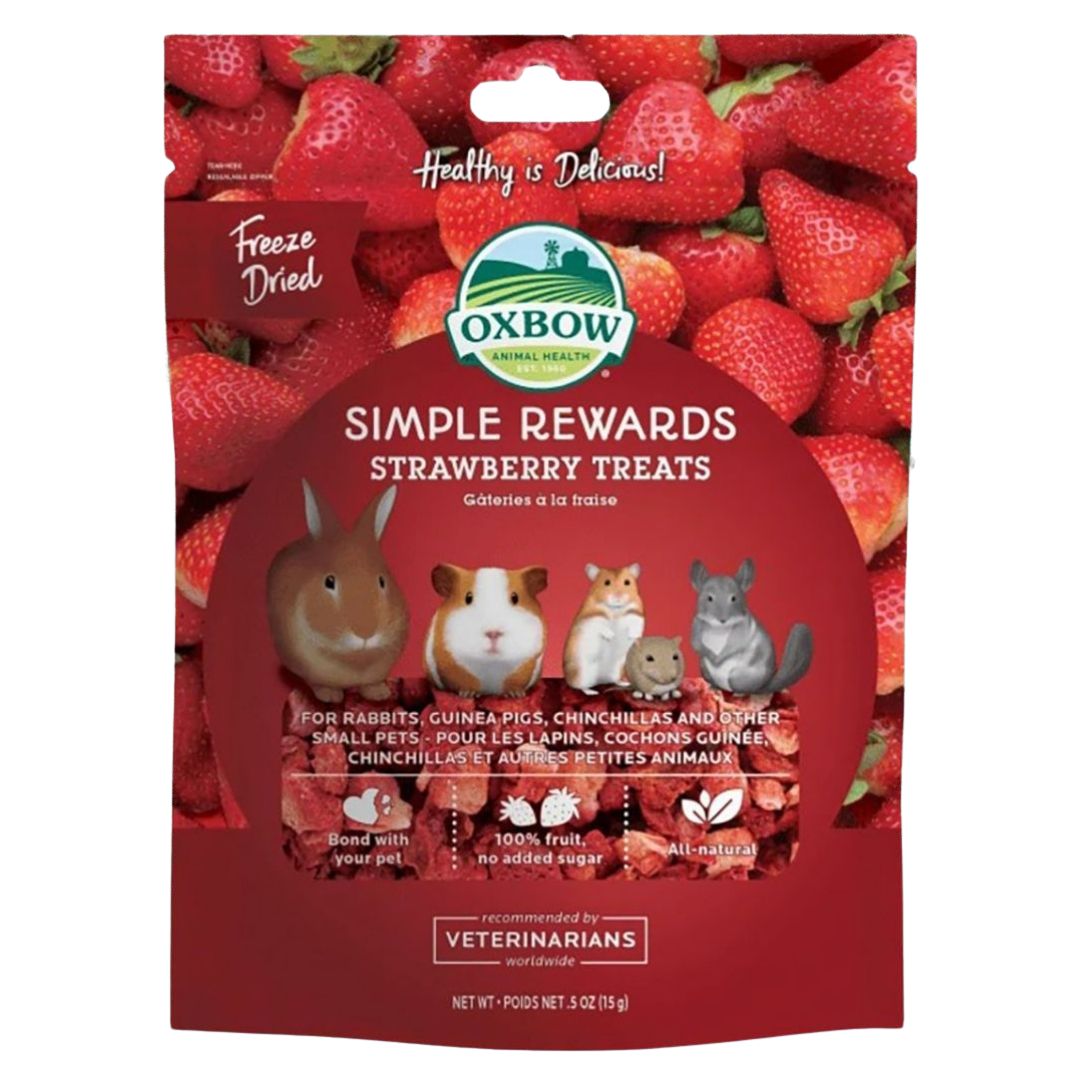 Do you have a favorite furry friend who loves treats? The Oxbow Simple Rewards Strawberry Treats will bring a healthy and tasty snack to your bunny, hamster, guinea pig, mouse, or chinchilla. The Oxbow Simple Rewards Strawberry Treats are healthy, natural snacks with no preservatives or artificial colors. The strawberry treats are freeze-dried and available in a 3 oz. package.