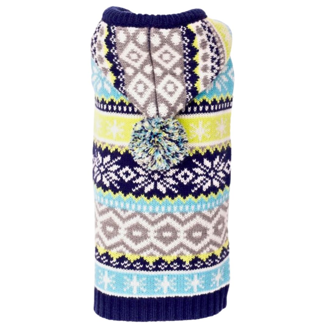 Does your favorite pup whine about the chilly air while out on a walk? Then, a Worthy Dog Fairisle Hoodie Blue Sweater with its colorful patterns of bright blue, cheery green, and bold navy will keep your pooch warm and cozy as the seasons change. Each pull-over style sweater is made of 100% durable acrylic yarn. The pompom-adorned hoodie will help keep ears warm in the frosty air. The “buttonhole” opening located on the back of the sweater allows a leash to be attached to your dog’s collar. The Worthy Dog Fairisle Hoodie Blue Sweater is available in sizes Extra Extra Small, Extra Small, Small, and Medium.