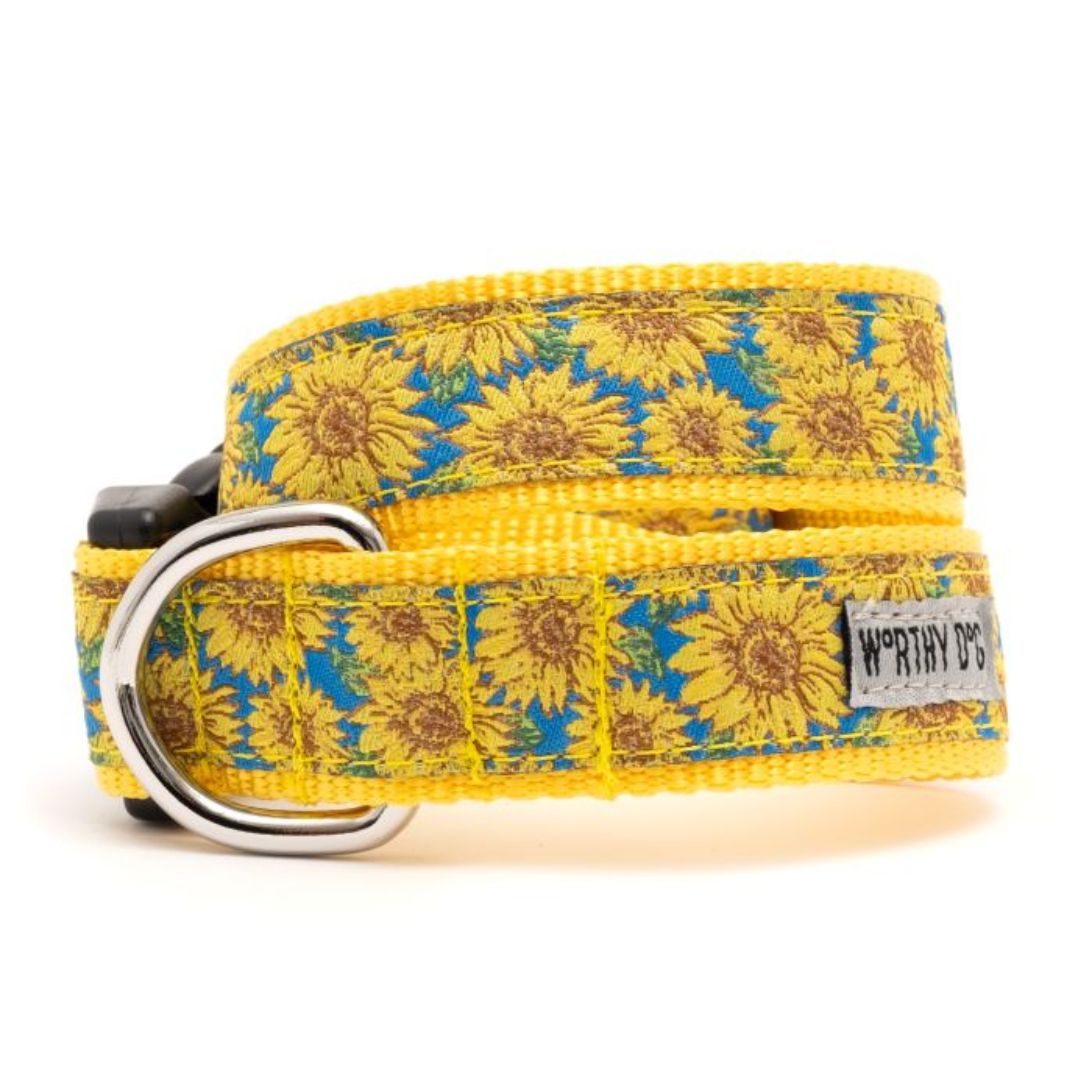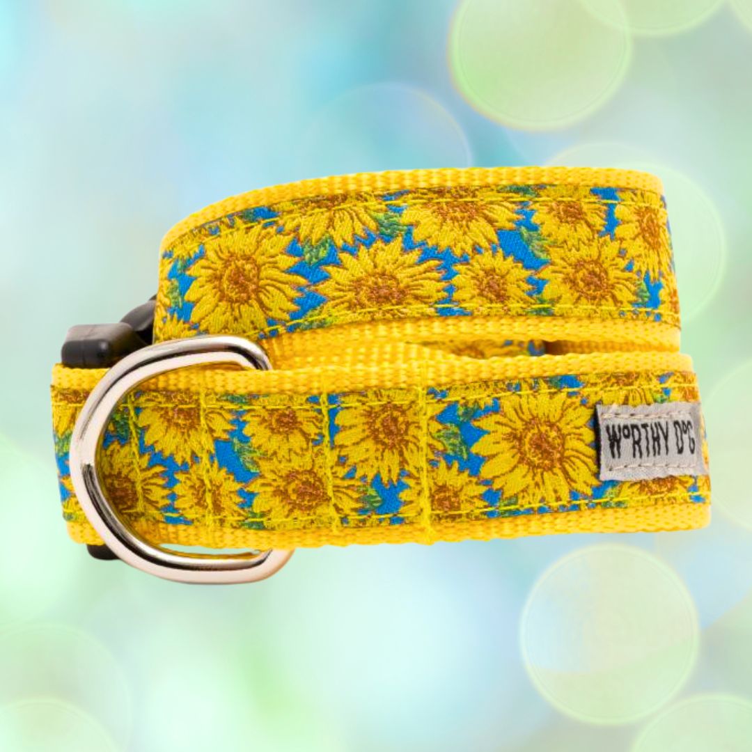 Does your favorite pup’s collar look worn and faded? A Worthy Dog Sunflower Collar will brighten your dog’s spirit with its cheery yellow flowers dancing on a bright aqua blue sky. Each collar is constructed of durable, woven nylon that is machine washable. The Worthy Dog Happy Sunflower Dog Collar has a sturdy, quick-release buckle and strong D-Rings for ID tags or leash attachment. Approximate sizes of collars are X-Small (1/2”x 6” to 12”), Small (1” x 9” to 15”), Medium (1”x 12” to 18”), Large (1” x 15” to 21”).